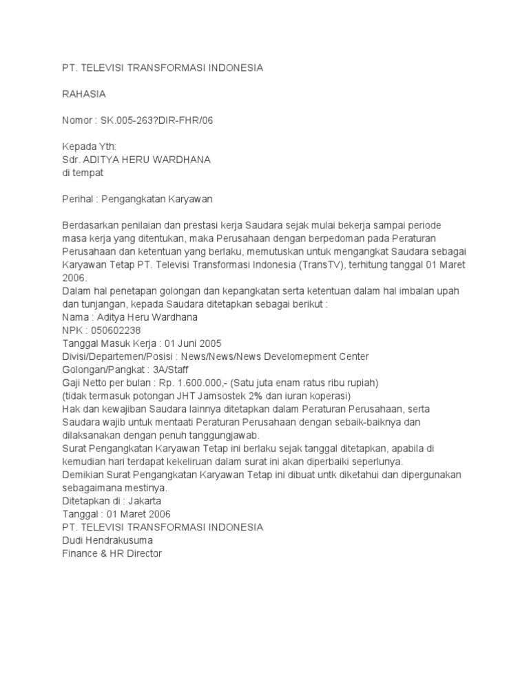 Contoh surat pengangkatan karyawan merupakan sebuah surat dari perusahaan atau instansi yang menjelaskan tentang pengangkatan karyawan yang sebelumnya berstatus karyawan magang atau karyawan kontrak berubah menjadi karyawan tetap. Merupakan salah satu surat perjanjian yang penting saat anda bekerja pada suatu perusahaan. Contoh surat pengajuan permohonan kenaikan gaji tanggal format 574 x 657 doc contoh surat permohonan kenaikan gaji yang bagus format 595 x 842 pixel download doc contoh surat kenaikan gaji karena sudah lama bekerja format 600 x 776 pixel download format. Download contoh surat pengangkatan karyawan tetap di perusahaan july 16, 2020 july 13, 2020 by nurul saputro surat pengangkatan karyawan tetap adalah sebuah surat yang dibuat oleh perusahaan atau instansi lain yang mana bertujuan untuk mengangakat seorang karyawan yang dulunya karyawan magang, ataupun karyawan kontrak menjadi karyawan tetap. Di bawah ini merupakan salah satu contoh dari surat pemberitahuan yang dikeluarkan oleh koperasi simpan pinjam dalam menindak karyawannya.